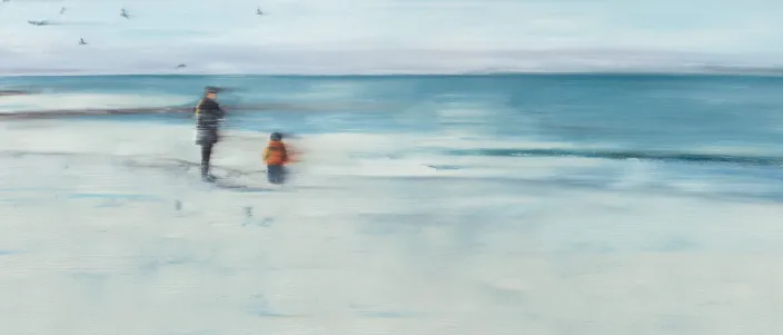 Die Lüneburger Künstlerin Anja Struck ist eine Meisterin der atmosphärischen Inszenierung. Das gilt zum Beispiel für ihre Arbeiten, in denen sie Mensch und Landschaft zusammenbringt. Typisch für diese Werke ist die Auflösung von Grenzen, das Verwischen der Motive und das Entstehen von Unschärfe. Strucks Protagonisten gehen ganz in ihrer Umgebung auf, sie verschwimmen geradezu darin und werden so zu einem Teil der Natur selbst. Dieser künstlerische Effekt vermittelt das Gefühl großer Freiheit, wie hier gemeinsam mit Kind an der eisblauen winterlichen Küste.