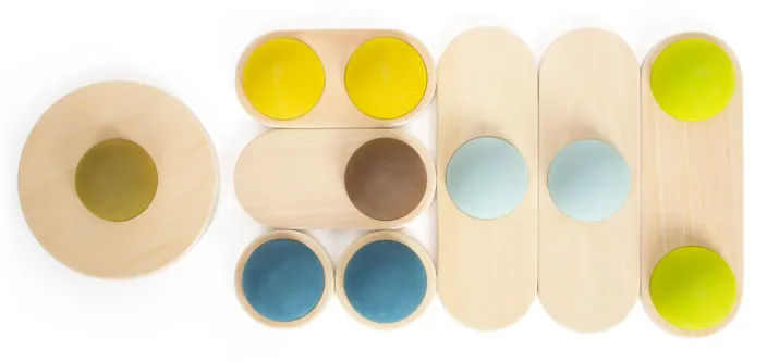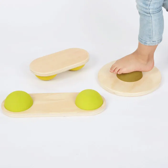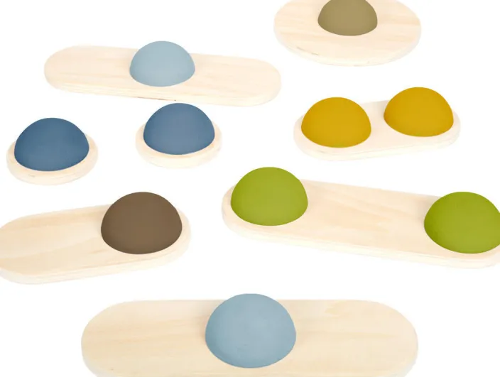 Diese beidseitig nutzbaren Balanciersteine aus stabilem Holz sprechen nicht nur den Gleichgewichtssinn und Bewegungsdrang kleiner Abenteurer an, sie trainieren auch mit viel Spaß Balance und Koordination! Der Grad der Herausfoderung hängt von den unterschiedlich angeordneten Halbkugelelemente aus robustem Schaumstoff unter jedem Balancierstein ab. Miteinander kombiniert, entsteht aus allen Steinen zusammen ein kreativer Balancierpfad mit individuell anpassbarem Schwierigkeitsgrad. Dabei regen einzeln platzierte Balanciersteine oder ein kompletter Balancierparcours zu immer neuen Spiel- und Bewegungsideen an. Auch für Therapiezwecke geeignet! Dank der schlichten Gestaltung und die simplen Formgebung in Kombination mit modernen Farben und viel naturfarbenem Holz passen sich die Steine jedem Wohn- und Kinderzimmer optimal an!