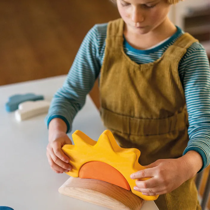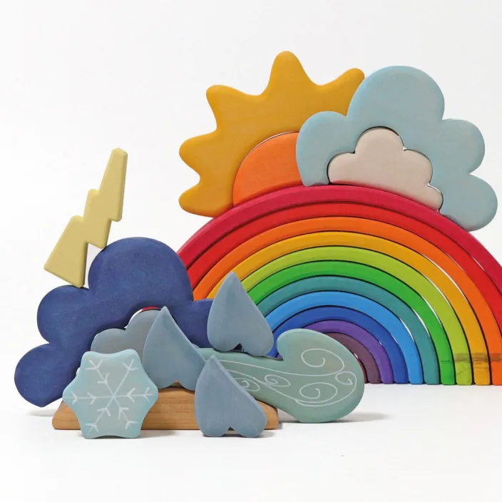 Mit dem Bauspiel können Kinder das Wetter ihrer Spielwelten selbst gestalten. Das Wetterspiel vermittelt die Thematiken Wetter und Natur auf erzählerische und greifbare Weise, wenn sich Wolken vor die Sonne schieben oder dunkle, regenschwere Wolken aufziehen. Das Set besteht aus 13 Teilen und ist aus FSC-zertifiziertem Linden- und Erlenholz gefertigt. Es ist ideal für Kinder ab 3 Jahren.