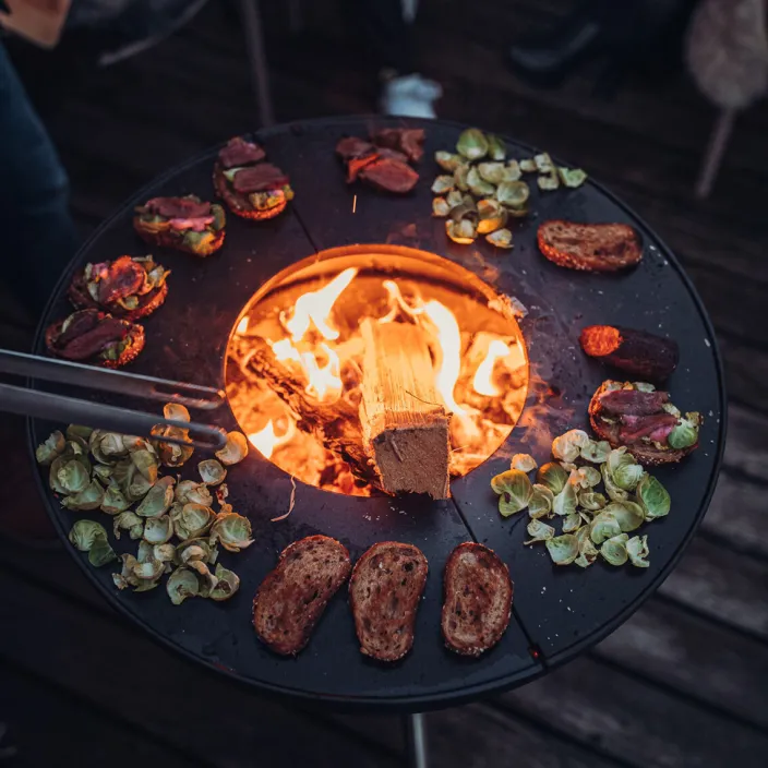 Es ist Zeit für lange Nächte und gemütliche Stunden! Mit »BOWL« der Feuerschale und dem dazugehörigen Plancha ist Kochen und gemütliches Sitzen am Lagerfeuer kein Problem. Der Plancha besteht aus einem Halbring und ist problemlos nutzbar. Beim Kauf von 2 Halbringen kann somit auf einer noch großzügigeren Grillfläche gegrillt werden. Eine Planchahälfte kann ebenfalls in Kombination mit einer Grillrosthälfte, die ebenfalls im Shop erhältlich ist, verwendet werden. Auf dem Plancha sind der Kreativität beim Kochen keine Grenzen gesetzt – unzählige Varianten sind denkbar! Das Kochen auf der Gusseisenplatte ist in einigen Kulturkreisen eine jahrtausendalte Tradition.