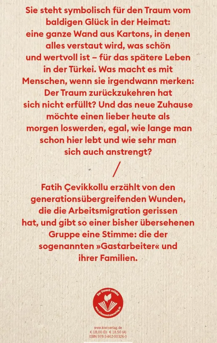 Alle Arbeitsmigrant:innen kennen sie, denn sie steht symbolisch für den Traum vom baldigen Glück in der Heimat: eine ganze Wand aus Kartons, in denen alles verstaut wurde, was schön und wertvoll war – für das spätere Leben in der Türkei. Willkommen war man in Deutschland nicht, doch was hält man nicht alles aus, wenn es nur von kurzer Dauer ist? Es lohnte sich weder, die deutsche Sprache zu lernen, noch sich ein Zuhause zu schaffen, schließlich sollte es bald zurückgehen. Die Kinder wurden als Kofferkinder hin- und hergeschickt. Was macht es mit Menschen, wenn sie irgendwann merken: Der Traum zurückzukehren hat sich nicht erfüllt?