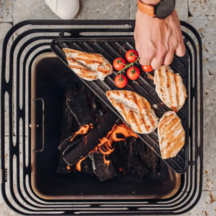 Aus dem Feuerkorb »CUBE« der Feuerkorb wird dank der massiven, emaillierten Gusseisenplatte ein Plancha Grill. Die Platten sind im Raster der Ausbrüche höhen- und hitzeregulierbar. Der Feuerkorb ist dank seines Zubehörs ein echter Allrounder!
