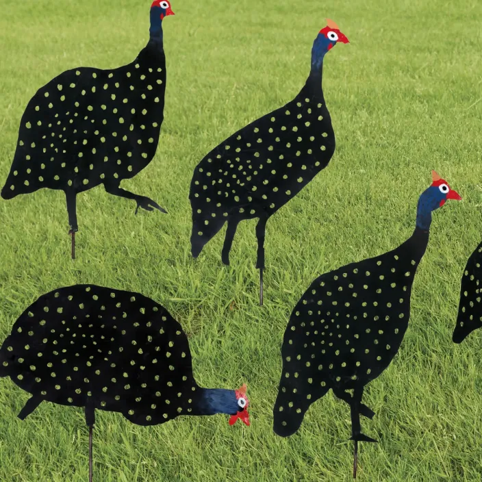 Die typische Musterung mit den perlweißen Tupfen machen diese Vögel so unverwechselbar. Aus Stahlblech gefertigt ziert das Set aus fünf Hühnern den Garten.