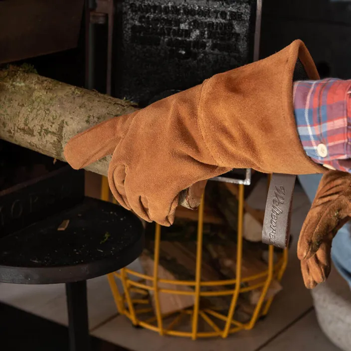 Garantierter Schutz und Komfort während verschiedenen Arbeiten. Die aus Leder gefertigten Handschuhe von Weltevree sind hitzebeständig und robust. Sie schützen Ihre Hände zum Beispiel beim Holzspalten, bei Wartungsarbeiten in Haus und Garten oder beim Hantieren mit hohen Temperaturen. Auch im Winter kann man mit den Handschuhen bequem draußen arbeiten, da sie vor Kälte schützen.