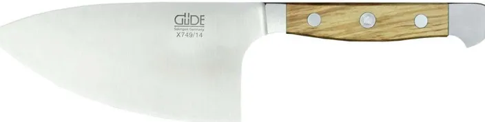 Alle Klingen der GÜDE Messer sind aus einem einzigen Stück Chrom-Vanadium-Molybdän-Stahl geschmiedet, scharf, sehr robust und rostfrei. Auch die Form der Messer ist bis ins kleinste Detail durchdacht und von Funktion und perfekter Handhabung geprägt. Sie liegen griffig und bequem in der Hand, lassen sich sicher führen und ermöglichen präzises, müheloses Arbeiten. Doch nicht nur in ihrer Funktionalität ist die Gestaltung außergewöhnlich, auch visuell lassen die Produkte durch ihre formvollendete Eleganz keine Wünsche offen. Das Kräutermesser »Shark« aus der Manufaktur GÜDE ist durch seine gewölbte Schneide ideal um Kräuter, Samen und Nüsse zu zerkleinern. Die Griffschale besteht aus bis zu 500 Jahre alten und ausgesuchtem Olivenholz, welches sehr hart, witterungsfest, stark gemasert und dadurch besonders elegant ist.