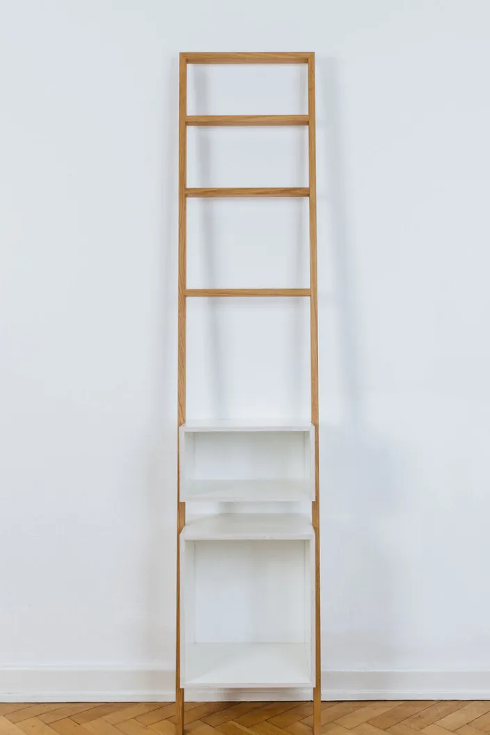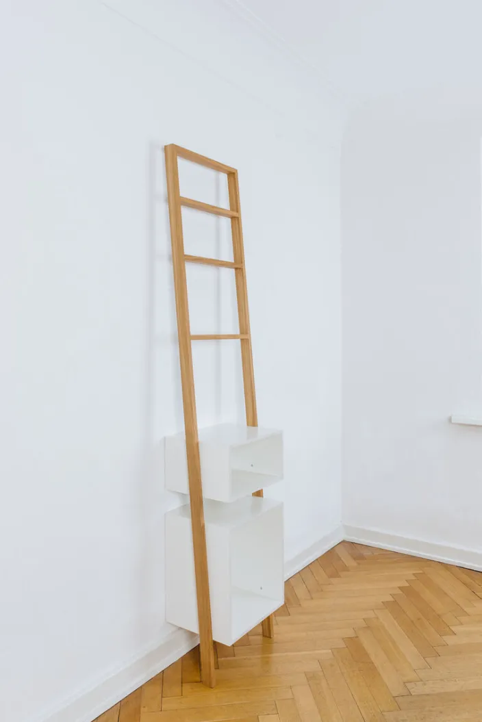 Das Regal ist mit einem Winkel von 5 Grad zur Wand geneigt und die Sprossen sowie die eingepassten Regalkästen sind horizontal eingefügt. Die Abstände der Sprossen sind so bemessen, dass darauf Taschenbücher, gebundene Romane und Bildbände untergebracht werden können. Die Regalkästen gibt es in drei verschiedenen Größen, angeordnet in drei Varianten. Ob alleine oder im Ensemble, das Leiterregal »brecht« überzeugt auch in kleinen Räumen und kann völlig flexibel umgestellt werden.