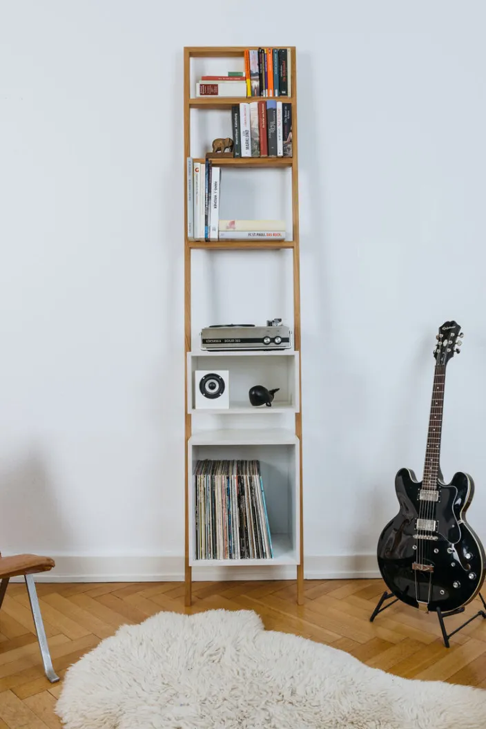 Ein lässig leichter Mitbewohner! Das Leiterregal wird einfach an die Wand gelegt und bietet Platz für Bücher, Vasen, Schallplatten, Nippes und vieles mehr. Die unkompliziert ausgefallene Konstruktion lehnt nur mit den Regalkästen an der Wand, während die Leiter frei schwebt. Das Ergebnis, ein solider, fester Stand, kann sich sehen lassen.