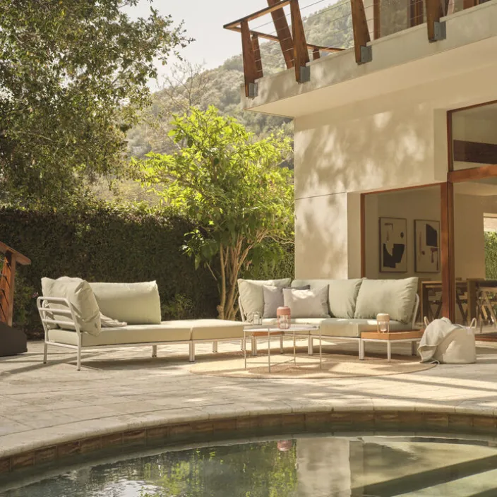 Der leichte Rahmen und die weichen Kissen schaffen sowohl Kontrast als auch Komfort – und locken mit entspannter Lounge-Atmosphäre.