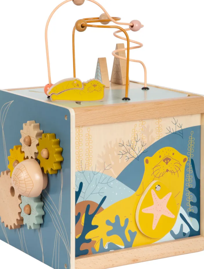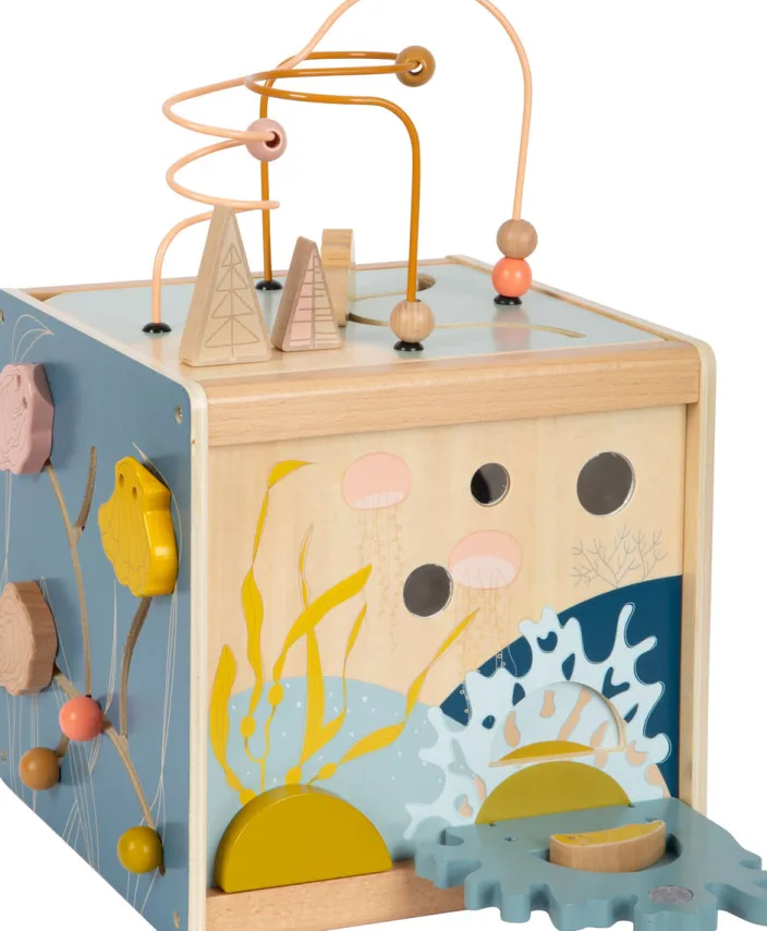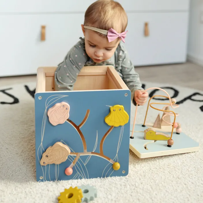 Vielseitiger Motorikwürfel aus Holz mit zwei Motorikschleifen, elastischen Bäumen zum Greifen und Federn sowie einem Schiebelabyrinth auf der Deckelseite. Das Zahnradspiel mit den vier abnehmbaren Seesternen und der handschmeichlerischen Qualle können kleine Tüftler als Steckspiel und zum spielerischen Kennenlernen des Ursache-Wirkung-Prinzips nutzen. Praktisch: Die Seestern-Zahnräder fungieren als Stecksteine für ein hinter einer Klappe verstecktes Steckspiel. Ein zweites Schiebelabyrinth sowie mehrere Spiegel und Kläppchen laden zum Ausprobieren, Entdecken und Staunen ein. Der abnehmbare Deckel kann platzsparend im Würfel verstaut werden. Der Motorikwürfel „Seaside“ überzeugt mit einer Kombination aus viel naturbelassenem Holz und sanften Trendfarben und sorgt mit abgerundeten Kanten für eine angenehme Haptik. Das Multitalent in punkto Spielen, Lernen und Entdecken trainiert die Wahrnehmung, fördert Geschicklichkeit und Feinmotorik, verbessert die Hand-Augen-Koordination und regt die Fantasie an.