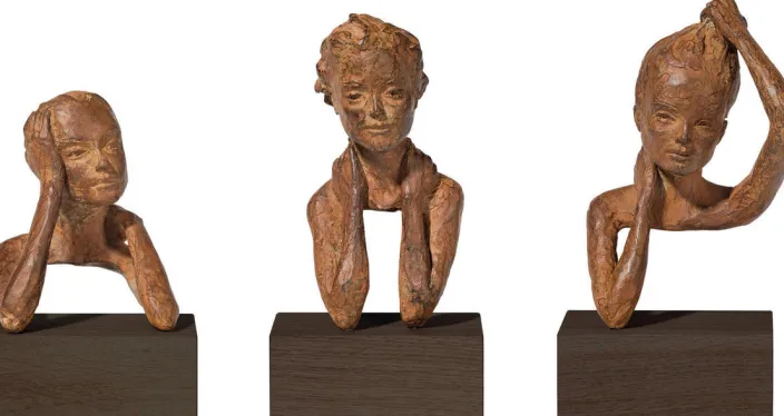 Valerie Otte gelingt es in ihrem neuesten, skulpturalen Werk, Emotionen eine materielle Form zu geben. In ihren sensiblen Porträts aus Bronze gewährt sie intime Einblicke in die menschliche Seele. Skulpturen in feiner Bronze, von Hand gegossen im Wachsausschmelzverfahren und rötlich patiniert. Auf einem Sockel aus Holz.
