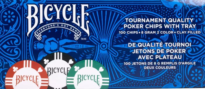Diese Premium-Pokerchips in Turnierqualität überzeugen! Ob daheim beim Spiel in Familie und Freundeskreis oder im Turniermodus – jeder Chip wiegt 8g, ist aus einem professionellen Ton(Clay)-Kunststoff-Gemisch hergestellt und kommt zweifarbig in rot/weiß, blau/weiß und grün/weiß auf den Tisch. In Turnieren benötigt jede:r Mitspielende ein Set mit 100 Chips.