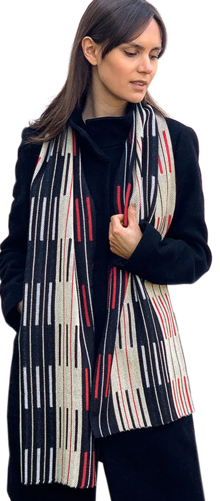 Entdecken Sie den Seidenschal in Natur und Schwarz mit roten grafischen Elementen – ein außergewöhnliches Accessoire, inspiriert von den Farben und dem Design des Bauhauses. Die schlichte Eleganz der reduzierten Musterung macht ihn zu einem vielseitigen Begleiter, der jedes Outfit bereichert und garantiert alle Blicke auf sich zieht. Dieser einzigartige Doublé-Schal wird in limitierter Auflage aufwendig am Handwebstuhl gefertigt, wodurch er seine unvergleichliche Ausstrahlung erhält. Sein Design ist eine Hommage an die beeindruckenden Webarbeiten der Textilkünstlerin und Bauhaus-Weberin Anni Albers.