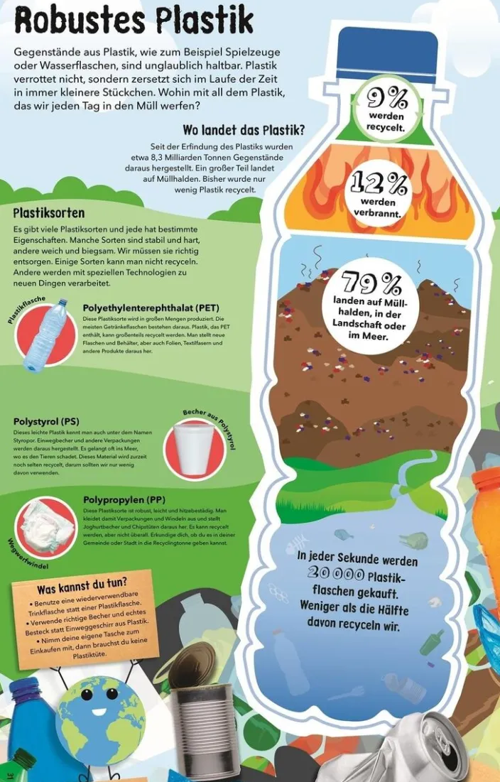 Wie viele Jahre braucht ein Plastikstrohhalm, um zu verrotten? Woraus besteht unser Haushaltsmüll? Dieses Buch klärt auf über Themen wie Klimawandel, Naturschutz und erneuerbare Energien. Zahlen und Fakten – in leicht verständlichen Infografiken aufbereitet – sowie anschauliche Abbildungen führen Kinder an wichtige Umweltthemen heran und zeigen den jungen Naturschützern, wie sie Müll vermeiden können. Mit Vorwort von NAJU, der Naturschutzjugend des NABU!