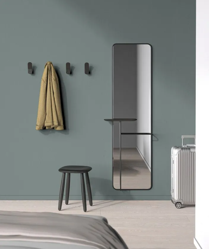 Der Spiegel zeichnet sich durch eine klare und minimalistische Ästhetik aus und ist ein praktisches und vielseitiges Möbelstück für den Flur, eine Mischung aus Kleiderschrank, Regal und Spiegel. Das Tablett aus massivem Eichenholz bietet bereits beim Betreten des Flurbereichs die Möglichkeit, Alltagsutensilien wie Schlüssel, Portemonnaie oder Schlüssel zu verstauen. Der schlanke und minimalistische Stahlrahmen bietet Platz zum Aufhängen von Regenschirmen und Schals.