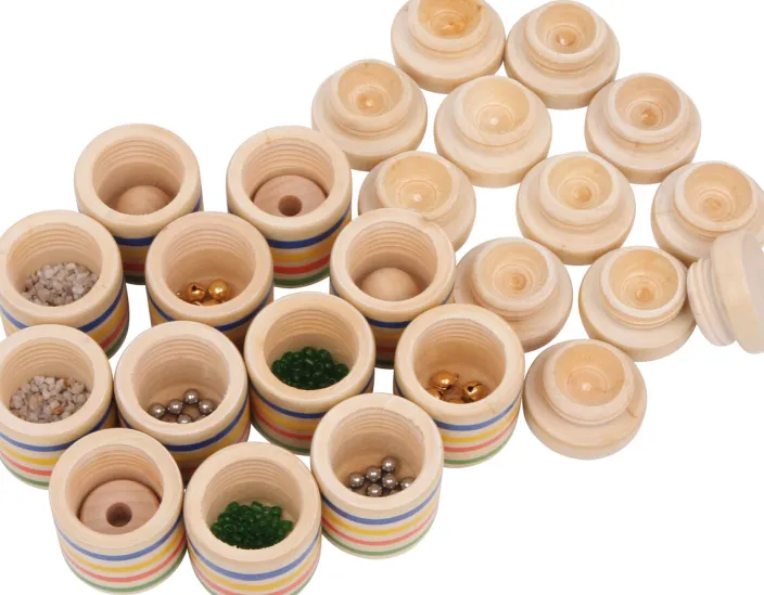 Das akustische Merk- und Gedächtsnisspiel aus zwölf hochwertigen Holzdosen erfordert eine ganz besondere Art der Merkfähigkeit! In je zwei Dosen sind dieselben Inhalte und müssen durch Klangvergleich herausgefunden werden! Holzringe klingen beim Schütteln anders als Holzkugeln, Reis anders als kleine Glöckchen und kleine Kieselsteinchen anders als feine Glasperlen. Für abwechslungsreichen Spielspaß können die zwölf Holzdosen dank abnehmbarer Deckel nach Belieben mit anderen Inhalten befüllt werden.