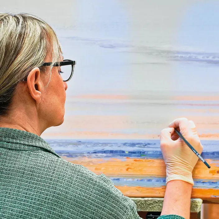 Jedes Exemplar »Leises Meeresrauchen« der Künstlerin Anja Struck aus Lüneburg ist einzigartig. Spaziergänger und Vogelschwarm werden von der Künstlerin nachträglich mit Ölfarbe eingefügt. Dieses serielle Unikat ist limitiert auf 75 Exemplare und wird per Hand nummeriert und signiert.