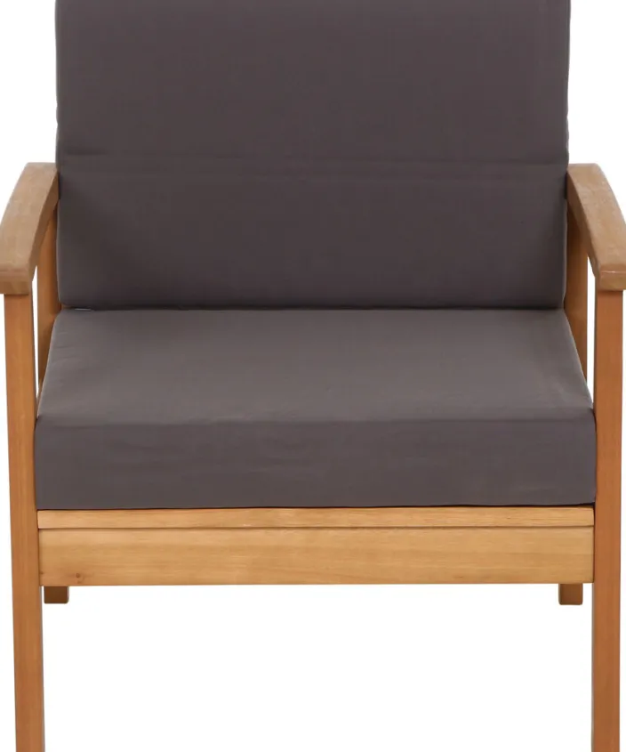Genießen Sie entspannte Stunden im Freien mit dem 4-teiligen Tavira Lounge Set von Sienagarden. Dieses exklusive Loungeset besteht aus zwei Sesseln, einem 3er Sofa und Lounge Tisch bietet Platz für bis zu 5 Personen. Gefertigt aus hochwertigem Eukalyptusholz erhält es durch eine spezielle Lasur die edle Teakoptik. Das FSC-zertifizierte Holz ist äußerst pflegeleicht und beständig gegen Witterungseinflüsse. Zudem harmonieren die warmen Farben des Holzes perfekt mit den grauen Sitz- und Rückenkissen aus langlebigem Polyester. Die Kissen sind speziell für Holzmöbel geeignet und bieten einen großzügigen Sitzkomfort.