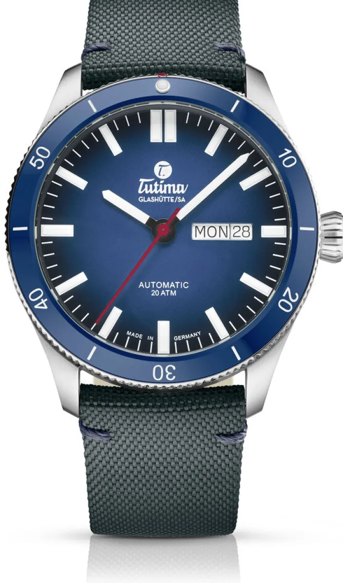 Die »Grand Flieger Airport Automatic« von Tutima Glashütte setzt die wegweisende Fliegeruhren-Tradition der Marke auf Höhe der Zeit fort – mit modernen Materialien und einem raffinierten Design, das nicht nur Pilotenherzen höherschlagen lässt. Limitiert auf 100 Exemplare präsentiert sich die exklusiv für die ZEIT kreierte Sonderedition in sportiv-klassischem Blau. Durch einen nach außen hin dunkler werdenden Farbverlauf des Zifferblatts entsteht ein faszinierender Tiefeneffekt, der durch die blaue, drehbare Lünette aus ultraharter, kratzfester Keramik noch einmal verstärkt wird. Harmonisch auf die Grundfarbe der Uhr abgestimmt wurde das blaugraue Gewebeband aus tragefreundlichem und dennoch überaus strapazierfähigem Cordura® mit blauer Ziernaht als Farbakzent und Innenfutter aus weichem Leder. Dank praktischer Faltschließe lässt sich das Band schnell und einfach auf den Umfang des Handgelenks einstellen.