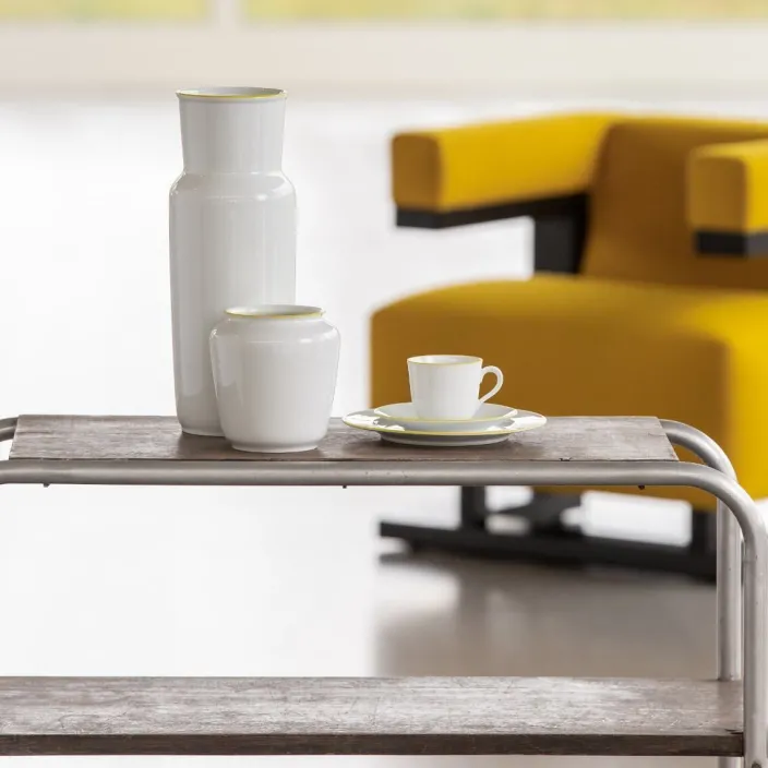 Geprägt vom Geist des Bauhauses, entwarf Wilhelm Wagenfeld 1934 für die renommierte Porzellanmanufaktur FÜRSTENBERG ein Service von zeitloser Eleganz. Nur für die ZEIT erscheinen zum 100-jährigen Bauhaus-Jubiläum ausgewählte Stücke der Premium-Kollektion als limitierte Sonderedition mit exklusiver farbiger Konturlinie.