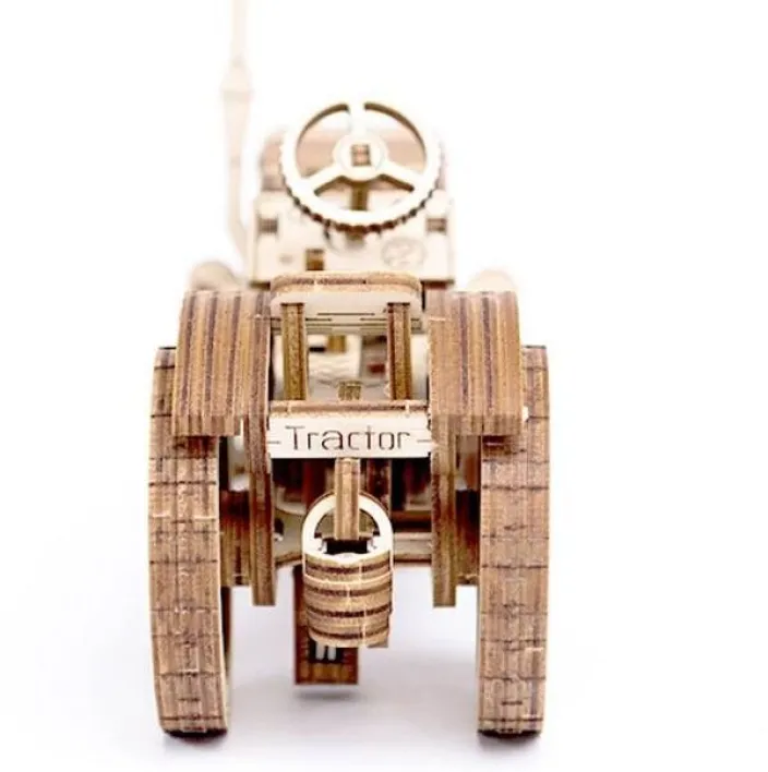 Der Traktor orientiert sich an Trecker-Modellen aus dem vergangenen Jahrhundert und wird mit einem Gummimotor angetrieben. Interessante Details und viele bewegliche Teile verleihen dem 3-D Holzmodell seinen ganz besonderen Charme: Armaturenbrett, geripptes Lenkrad, an einem Haken hängender Eimer. Der Traktor verfügt über ein Chassis und große Allradräder aus Gummi.