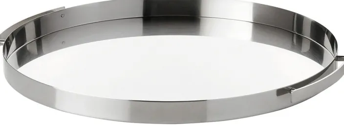 Das Arne Jacobsen Serviertablett aus der Cylinda-line Serie passt zusammen mit den ikonischen Servierkannen und zum Barset. Das Tablett aus Edelstahl hat zwei funktionelle Griffe und einen Durchmesser von 33,5 cm.