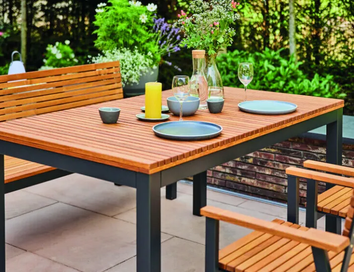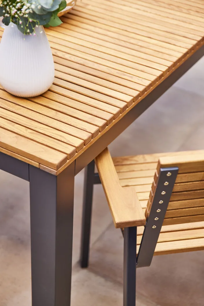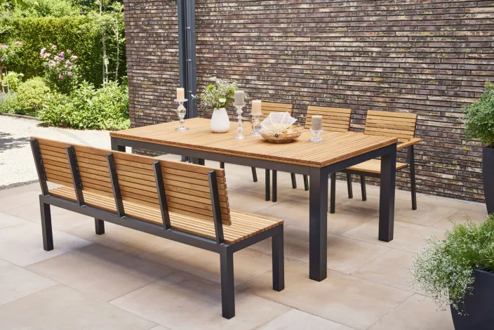 Die elegante Serie Bozen von Siena Garden steht für Nachhaltigkeit und elegantes Design für Ihren Garten. Das hochwertige Robinienholz FSC® 100% ist von Natur aus widerstandsfähig gegen Fäulnis, Insekten und Witterungseinflüsse, was das Material zu einer der langlebigsten Optionen für den Einsatz im Freien macht. Dies bedeutet, dass die Serie Bozen eine lange Lebensdauer hat und Ihnen viele Jahre Freude bereiten wird. Das pulverbeschichtete und in matt anthrazit eingefärbte Aluminium-Gestell ist sehr widerstandsfähig gegen Witterungseinflüsse wie Regen, Sonne und Schnee sowie gegen Korrosion und Rost. Darüber hinaus ist es sehr einfach zu pflegen und erfordert nur eine regelmäßige Reinigung mit Seifenwasser, um Schmutz und Ablagerungen zu entfernen.