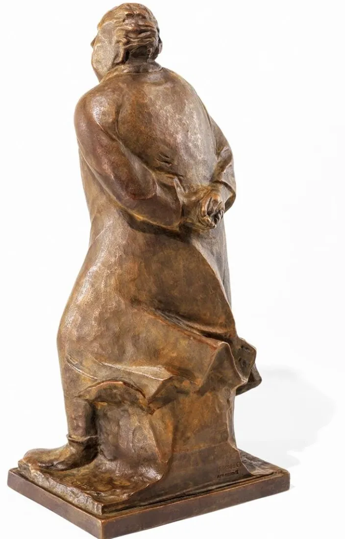 Ein gereifter Mann stapft mit auf dem Rücken verschränkten Händen gegen den Wind. Die Skulptur erinnert an den Geheimrat von Goethe oder auch an Ludwig van Beethoven, der seinen Weg durch die Altstadtgassen von Wien nimmt.