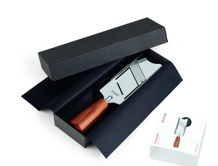 Der triangle Feinhobel »Soul« ist stufenlos verstellbar und schneidet aromatische Zutaten wie Trüffel, Knoblauch, Zwiebeln und Meerrettich in hauchfeine Scheiben. Etwas dicker eingestellt ist er der ideale Alltagshobel für Gurken, Zucchini, Kartoffelgratin etc. Nichts bleibt zurück, denn der durchdachte Restehalter ermöglicht die Verwertung bis zur letzten Scheibe. Der Natur zuliebe stammen alle Hölzer aus nachhaltig bewirtschafteten deutschen Obstwiesen und Privatwäldern und sind FSC zertifiziert. Die Griffe werden im Sauerland gedrechselt, anschließend in Solingen fein bearbeitet und mit Funktionsteilen aus Edelstahl konfektioniert. Als ideales Geschenk werden die „Soul“-Produkte in einem stilvollen und wiederverwendbaren Geschenkkarton geliefert.