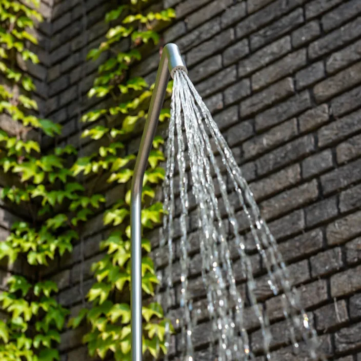 Die Gartendusche »Serpentine« ist komplett aus rostfreiem Edelstahl gefertigt. Der Duschkopf hat ein einzigartiges Design. Auch wenn er von außen wie ein einfaches und geradliniges Rohr aussieht, ist der Wasserstrahl im Inneren in kleinere Röhren umgestaltet. Der Duschkopf verteilt den Strahl zu einem breiten und komfortablen Duschstrahl, genau wie bei einer normalen Dusche.