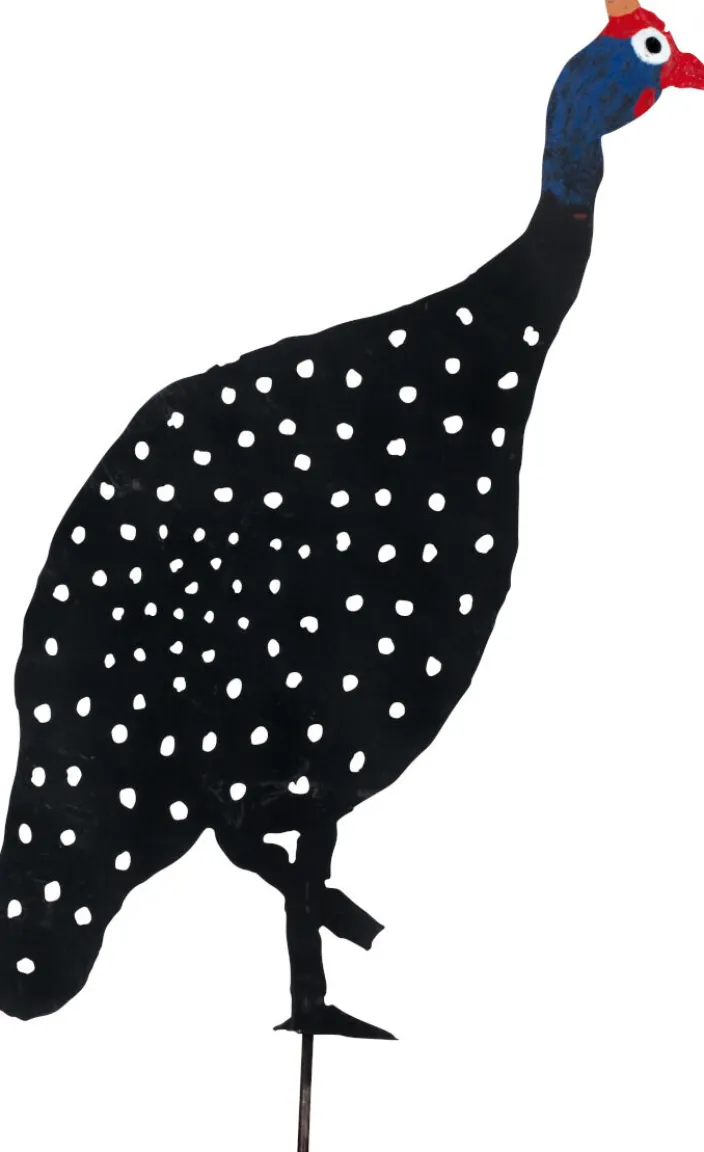 Die typische Musterung mit den perlweißen Tupfen machen diese Vögel so unverwechselbar. Aus Stahlblech gefertigt ziert das Set aus fünf Hühnern den Garten.