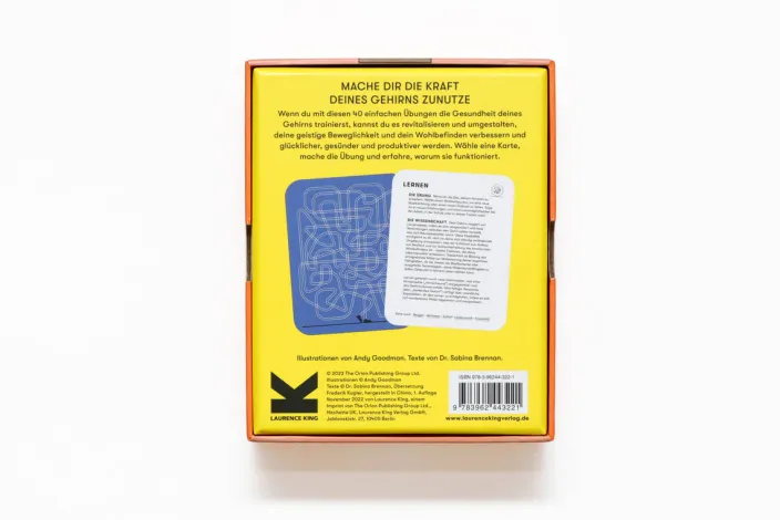 Machen Sie sich die Kraft Ihres Gehirns zunutze! Wenn Sie mit diesen 40 einfachen Übungen die Gesundheit Ihres Gehirns trainieren, können Sie es revitalisieren und umgestalten, Ihre geistige Beweglichkeit und Ihr Wohlbefinden verbessern und glücklicher, gesünder und produktiver werden. Wählen Sie eine Karte, machen Sie die Übung und erfahren Sie zudem, warum sie neurologisch funktioniert. Autorin: Sabina Brennan Dr. Sabina Brennan ist Forschungspsychologin und preisgekrönte Wissenschaftskommunikatorin. Derzeit arbeitet sie als Research Assistant Professorin am Institute of Neuroscience am Trinity College Dublin. Ihre wissenschaftliche Forschung konzentriert sich auf Demenzerkrankungen, sowie deren Risiken und Schutzfaktoren, um einen Rückgang der kognitiven Funktion verhindern oder verzögern zu können.