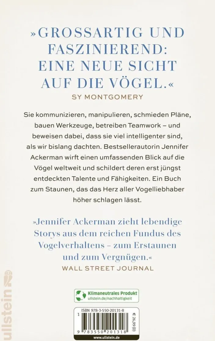 »Jennifer Ackerman zieht lebendige Storys aus dem reichen Fundus des Vogelverhaltens ¿ zum Erstaunen und zum Vergnügen.« WALL STREET JOURNAL