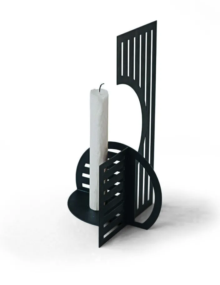 Der Kerzenhalter ist mit seinen grafischen Kreis- und Rechteckformen inspiriert vom Bauhausstil. Aus pulverbeschichtetem Stahl.