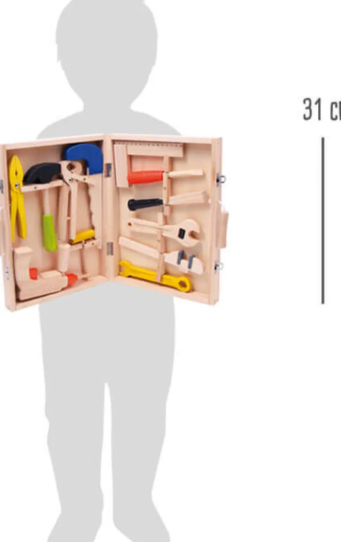 Kleine Handwerker ab 3 Jahren aufgepasst! Mit diesem hochwertigen Werkzeugkoffer aus Holz sind die Kleinen auf jeder Baustelle perfekt ausgestattet. Im praktischen Holzkoffer sind die Werkzeuge mit Klett oder an einer Holzleiste befestigt. Mit ihrem Werkzeug können die Kleinen die Großen kinderleicht unterstützen und lernen ganz spielerisch die Handhabung der verschiedenen Arbeitsgeräte. Die Bohrmaschine ist mit Klettpunkten befestigt, die anderen Werkzeuge stecken in der Holzleiste mit drehbarer Sicherung.