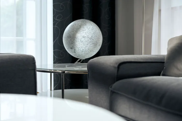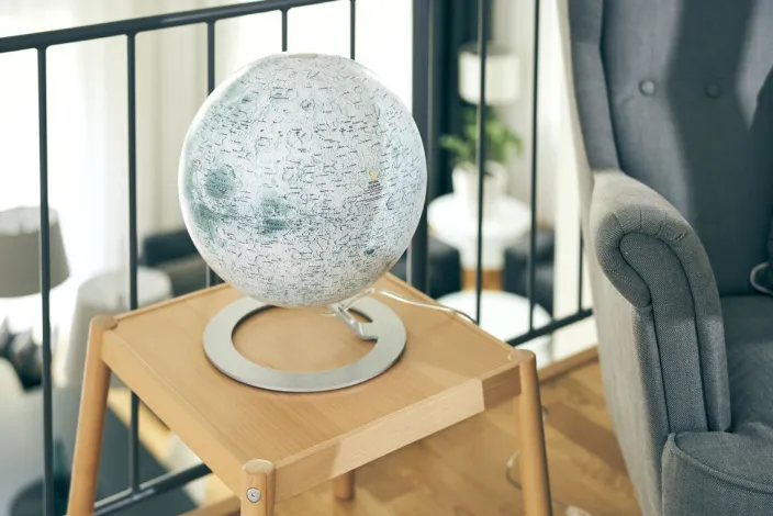 Mit Hilfe des National Geophraphic Leuchtglobus »The Moon« von Räthgloben können Sie den Mond genau unter die Lupe nehmen! Dieser ist beschriftet und bildet die typischen Krater sowie Erhöhungen ab. Farblich entspricht dieser dem Original im All sehr genau. Nicht nur Weltraumfans, sondern Designliebhaber aller Art werden am »The Moon« von Räthgloben ihre Freude haben – schließlich setzt der 30 cm im Durchmesser große Mondglobus leuchtende Akzente auf Beistelltisch, Nachttisch & Co. Der National Geophraphic Leuchtglobus setzt sich zusammen aus dem eigentlichen Globus sowie einem eleganten Aluminiumfuß, der mit einem intelligenten Kabelauslass ausgestattet ist. Im Inneren sorgt ein im Lieferumfang inbegriffenes energiesparendes Kompaktleuchtstoffmittel von 7 Watt der Energieffizienzklasse A+ für die nötige Beleuchtung.