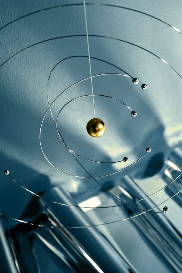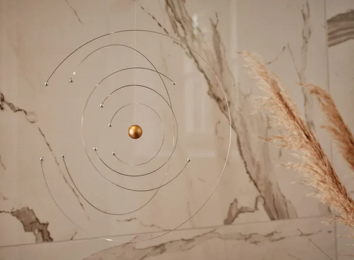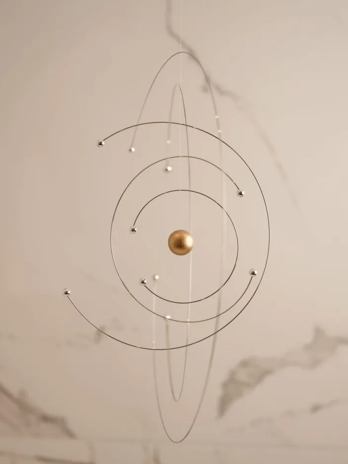 Das filigrane Mobile »Niels Bohr« besteht aus leichten und schwere Elemente in einer dynamischen Spannung, die nach dem Bohrschen Atommodell (1913) angeordnet sind. Designt von Christian Flensted verleihen die Mobiles aus Edelstahlringen und Holzkugel jedem Raum einen ganz eigenen, frisch modernen Charm. Das simple Design der dänischen Klassiker bringt ein Stück Freiheit und Abenteuer in jedes Zuhause.