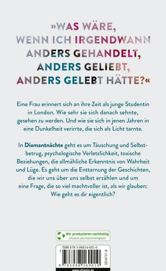 In Diamantnächte geht es um Täuschung und Selbstbetrug, psychologische Verletzlichkeit, toxische Beziehungen, die allmähliche Erkenntnis von Wahrheit und Lüge. Es geht um die Enttarnung der Geschichten, die wir uns über uns selbst erzählen und um eine Frage, die so viel machtvoller ist, als wir glauben: Wie geht es dir eigentlich?