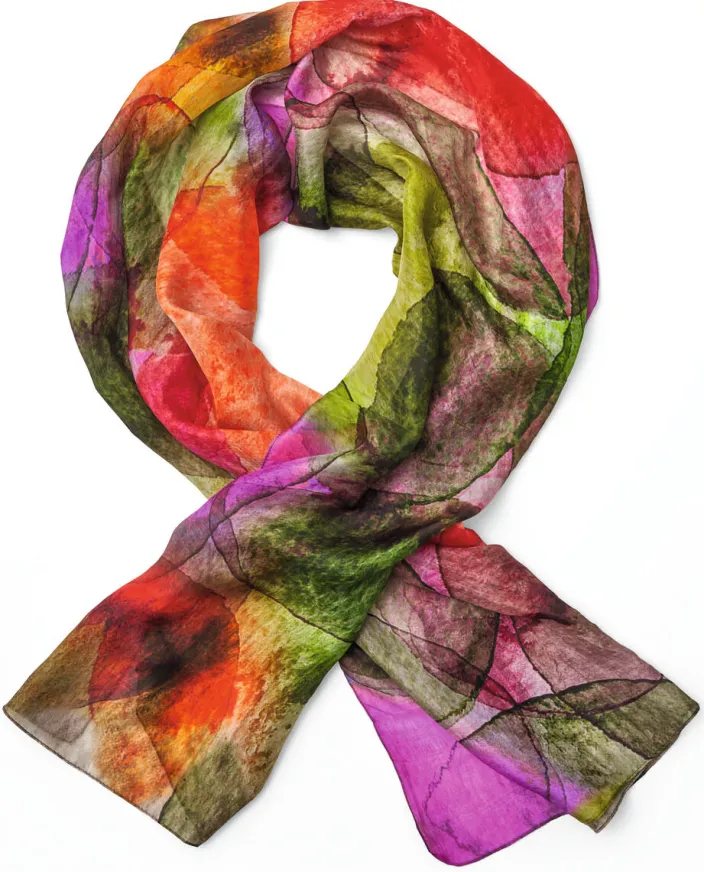 Eine harmonische Kombination aus kräftigen Rot- und Violetttönen und warmen Erdfarben bietet dieser edle Schal aus 100%iger Seide.