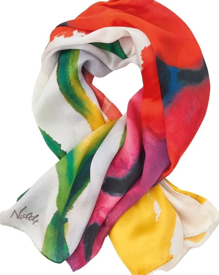 Stilvolles Seidentuch mit einem Ausschnitt aus Noldes harmonischer Komposition von »Schwertlilien und drei Mohnblüten« (Gelb, Violett, Rot). Herausgegeben in Zusammenarbeit mit der Nolde Stiftung Seebüll.