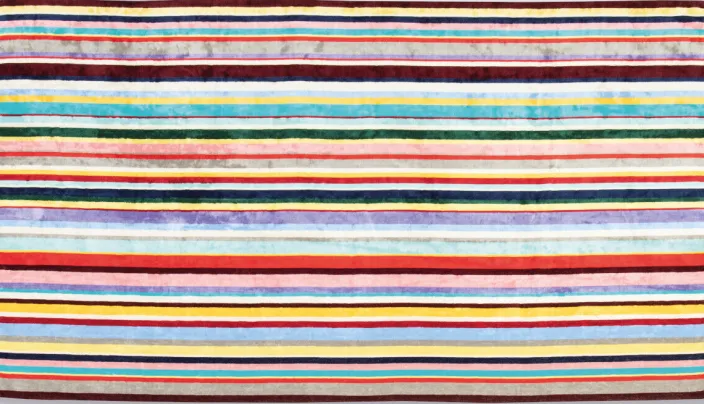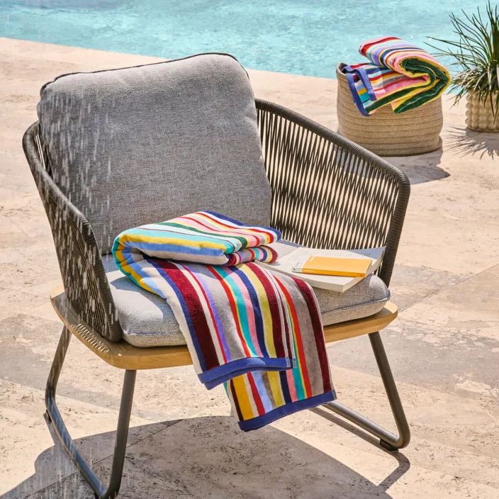 Das riesige Luxusbadehandtuch im Multicolor Streifendesign umfasst ein pures Kuschelerlebnis und ist der ideale Begleiter für Terrasse, Strand oder Schwimmbad.