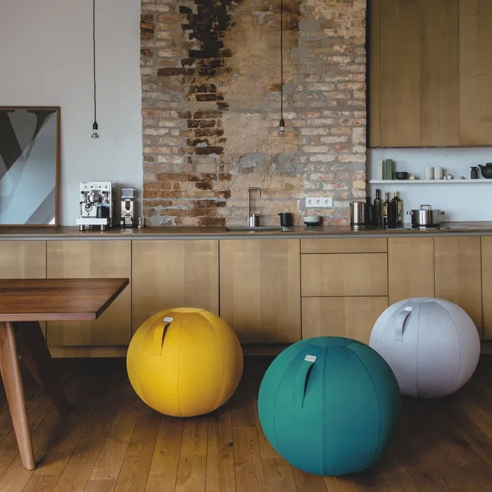 Gymnastikbälle neu interpretiert: Die edlen Sitzbälle von »Vluv« werden mit hochwertigen Stoffen in verschiedenen Farben und Ausführungen versehen. Damit ähneln sie eher modernen Design-Sitzmöbeln als Sportgeräten. Der erste aufblasbare Sitzball aus robustem Möbelstoff steht für gesundes und aufrechtes Sitzen und fügt sich dezent bei Ihnen zu Hause in die Wohn- oder im Büro in die Arbeitswelt ein. Mit seinem praktischen Griff kann der »Vluv« problemlos und ohne großen Aufwand von einem in den anderen Raum getragen werden. Der patentierte Bodenring verhindert zudem ein zu leichtes Wegrollen.