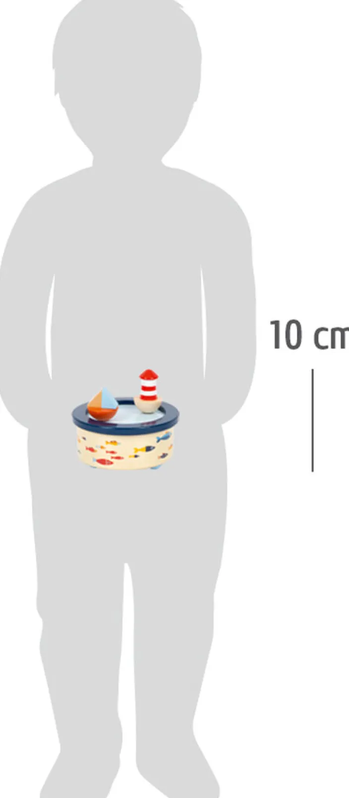 Die maritime Spieluhr »Großer Ozean« aus Holz verzaubert mit dem Schlaflied »Weißt Du, wieviel Sternlein stehen« und begleitet Kinder behutsam ins Land der Träume. Ein kleines Schauspiel entfaltet sich, wenn der Leuchtturm und das Segelboot im Takt der Melodie sanft im Kreis tanzen. Mit kinderleichter Bedienbarkeit ist diese Spieluhr besonders auf die kleinen Hände zugeschnitten. Die abnehmbaren Holzfiguren ermöglichen es sogar den Kleinsten, die Spieluhr eigenständig zu nutzen. Das zentrale Designelement der Unterwasserwelt begeistert mit liebevollen Details und kinderfreundlichem Charme. Neben ihrer Funktion als Einschlafhilfe wird die Spieluhr zu einem dekorativen Blickfang im Kinderzimmer. Abgerundete Kanten verleihen nicht nur eine angenehme Haptik, sondern unterstreichen auch die hochwertige Verarbeitung.