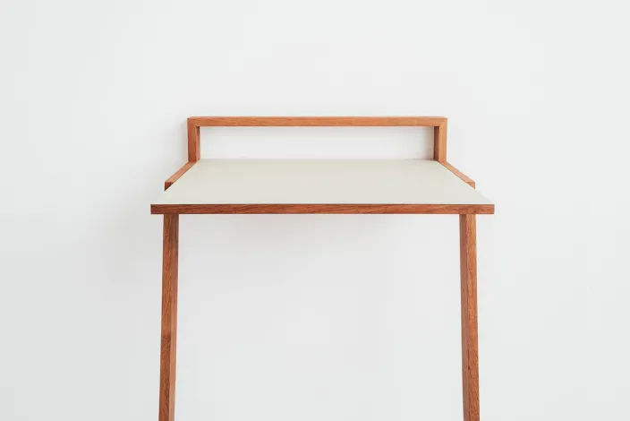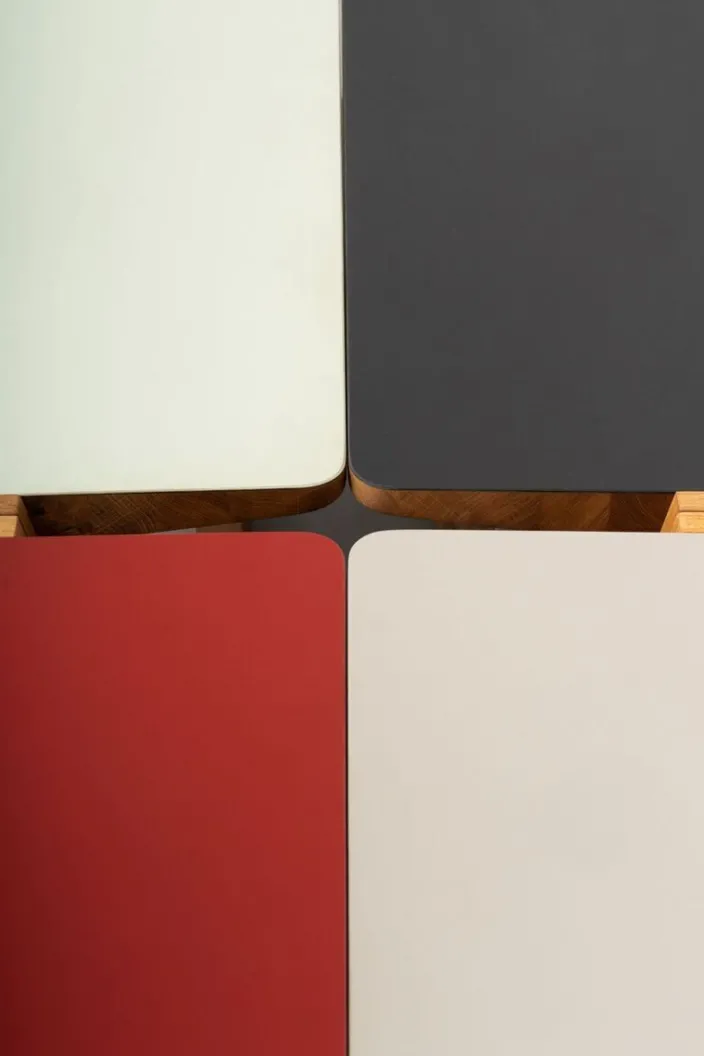 Die Arbeitsfläche besteht aus Eichenholz, belegt mit Möbellinoleum und ist in einen Rahmen aus geölter Eiche eingefasst. Die gefräste Nut am umlaufenden Steg verhindert das Wegrollen der Stifte und bietet Platz für Postkarten und Memozettel.