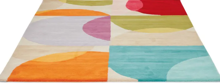 Farbenfroher Teppich mit schönen Mustern und Formen aus 100% Schurwolle. Auch geeignet für Fußbodenheizungen.
