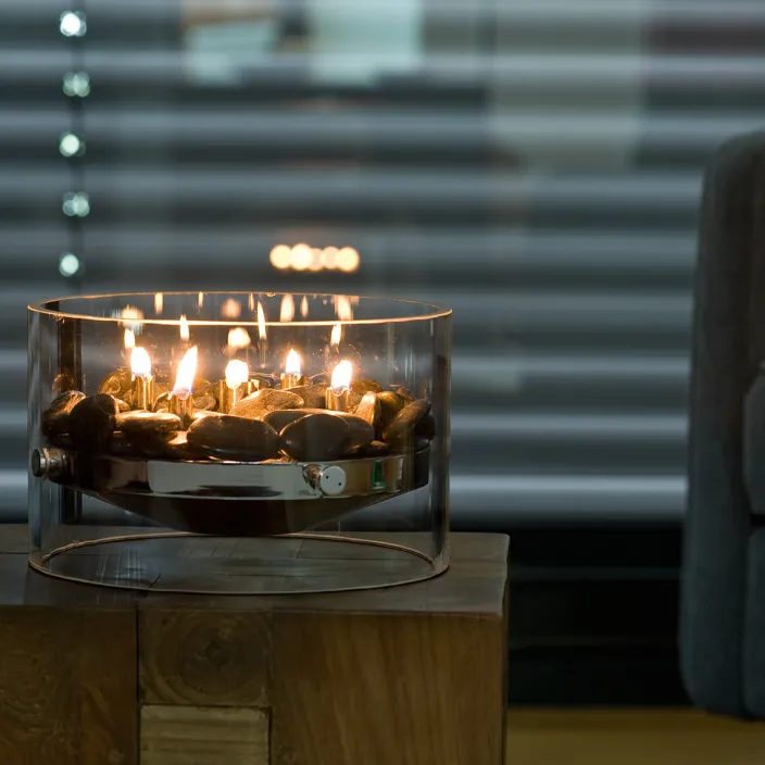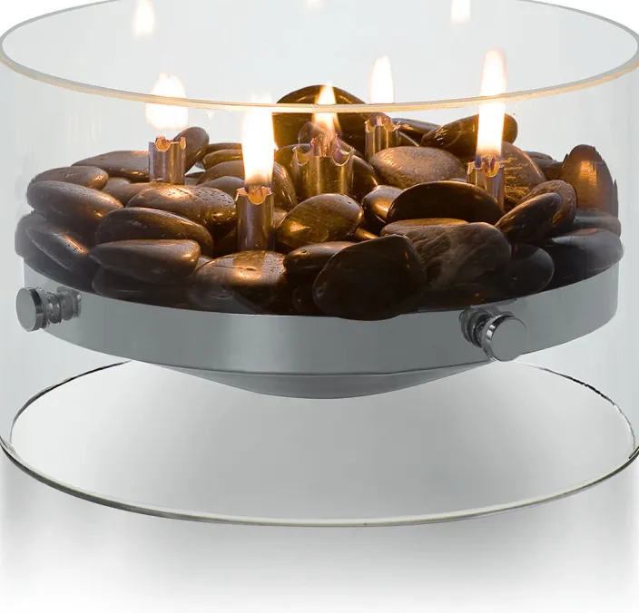 - Aus Glas, Edelstahl, Glasfaserdochte, Flusssteine