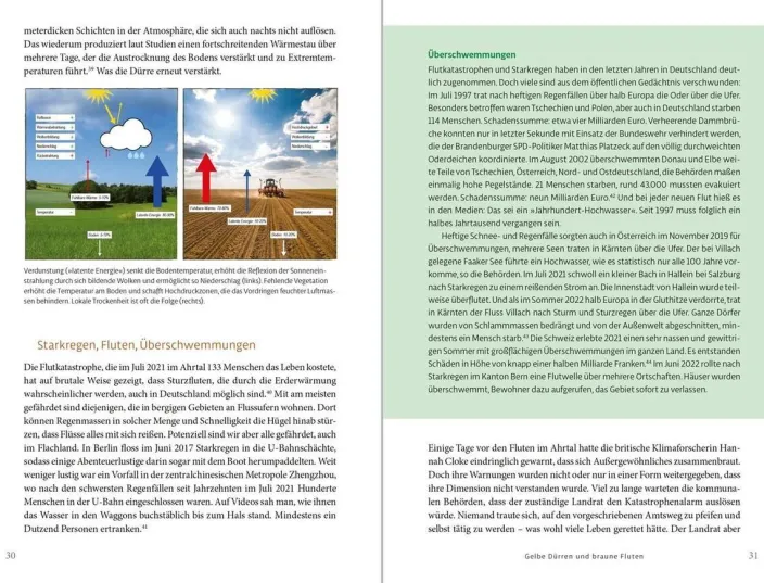 »Das Buch zeigt einen ganz neuen Blick auf die Klimakrise. Und eine Handlungsoption: Klimalandschaften!« Dr. Felix Prinz zu Löwenstein Dieses Buch wirft einen völlig neuen Blick auf die Klimakrise: Alle reden nur von CO2, dabei sind Dürre, Hitze und Fluten auch Folgen von massiven Veränderungen der Landschaft, Bodenversiegelungen und gestörten Wasserkreisläufen. Die gute Nachricht: Daran können wir etwas ändern, ohne darauf warten zu müssen, dass die nächste Klimakonferenz endlich Ergebnisse bringt. Lokale Gruppen und engagierte Kommunen können zwar nicht den CO2-Gehalt der Atmosphäre senken, wohl aber die Temperaturen vor Ort. Wasser und Vegetation sind dabei die Lösung: Gelingt es uns, mehr Wasser in der Landschaft zu speichern sowie Städte und Landschaften zu begrünen, kann es mehr regnen und kühler werden, die Überschwemmungsgefahr sinkt. So bekommen wir drei Lösungen zum Preis von einer: Klima-, Arten- und Gesundheitsschutz. Das Buch nimmt uns mit in intakte Flusslandschaften, Acker und Flure, zukunftsfähige Wälder sowie Städte, die Wasser wie Schwämme speichern, statt es in die Kanalisation zu leiten. Ein Buch, das Mut macht und zum Nachmachen inspiriert.