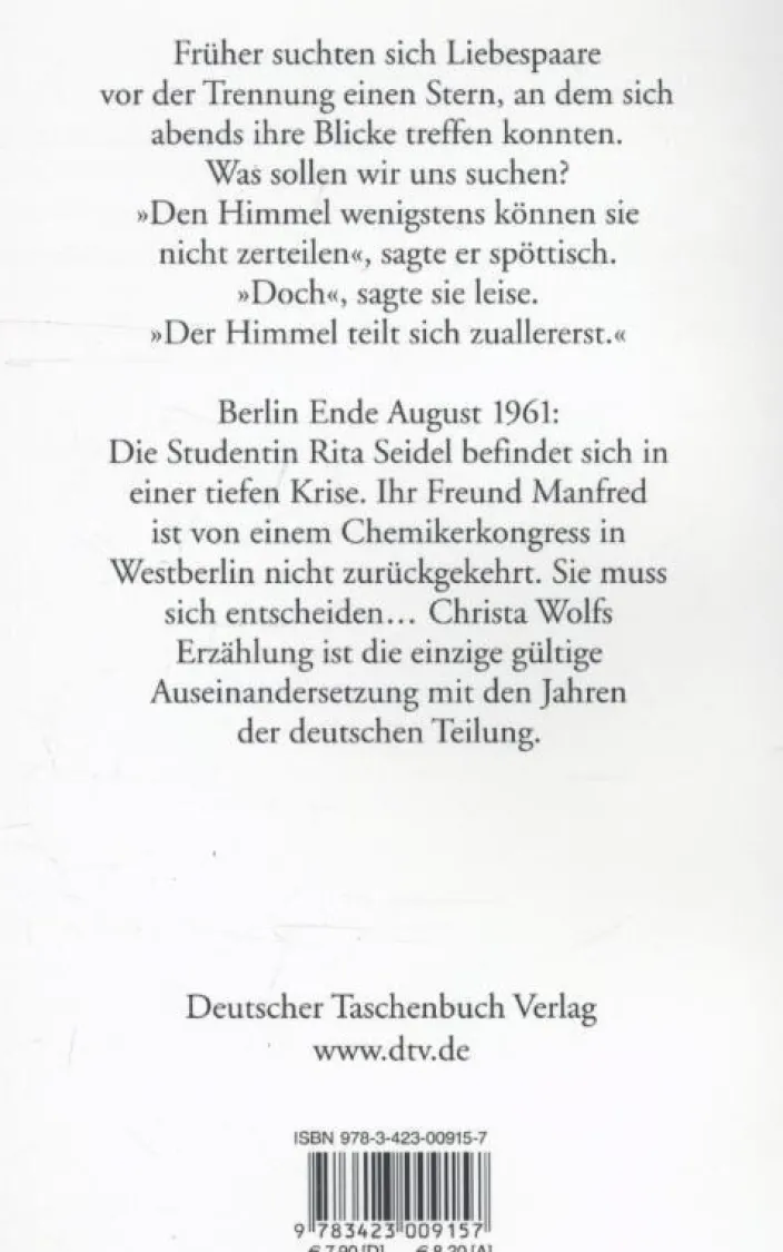 Ende August 1961: In einem kleinen Krankenhauszimmer erwacht Rita Seidel aus ihrer Ohnmacht. Und mit dem Erwachen wird auch die Vergangenheit wieder lebendig. Da ist die Erinnerung an den Betriebsunfall und vor allem die Erinnerung an Manfred Herrfurth. Zwei Jahre sind vergangen, seit sie dem Chemiker in die Stadt folgte, um an seiner Seite und mit ihm gemeinsam ein glückliches Leben zu beginnen. Wann hat die Trennung begonnen? Hat sie die ersten Anzeichen einer Entfremdung übersehen? Denken, Grübeln, Fiebern – Tage und Nächte hindurch! »Ich gebe Dir Nachricht, wenn Du kommen sollst. Ich lebe nur für den Tag, da Du wieder bei mir bist.« Manfred ist von einem Chemikerkongreß in Westberlin nicht zurückgekehrt in dem festen Glauben, daß Rita ihm folgen wird. Sie muß eine Entscheidung treffen, die sie in eine tiefe Krise stürzt.