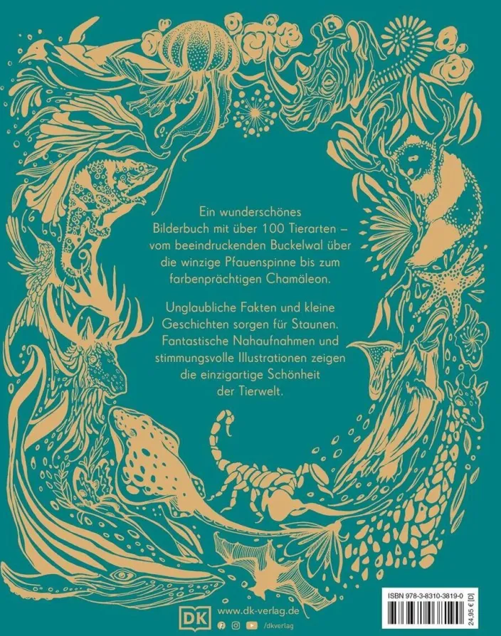 Vom riesigen Buckelwal bis zur winzigen Pfauenspinne – dieses stimmungsvolle Tierbilderbuch zeigt über 100 der faszinierendsten Lebewesen der Welt auf zauberhafte Weise! Beeindruckende Fotografien, Illustrationen und spannende Texte entführen junge Tierfreunde wie in einem Märchenbuch in die fantastische Welt der Tiere. Das hochwertige Cover mit Goldfolie, Lesebändchen und Goldschnitt machen dieses Bilderbuch zum einzigartigen Schmökererlebnis und perfekten Geschenk!