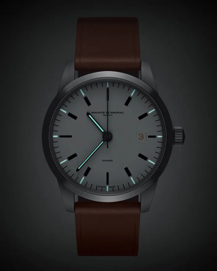 Exklusiv für DIE ZEIT erscheint die »L1« (39mm) der Zürcher Uhrenmanufaktur MAURICE DE MAURIAC mit einer Datumsanzeige in einem charmanten Cognac-Ton und passenden, handgefertigten Armband aus feinstem Barenia Leder und in einer limitierten Auflage von nur 50 Stück.